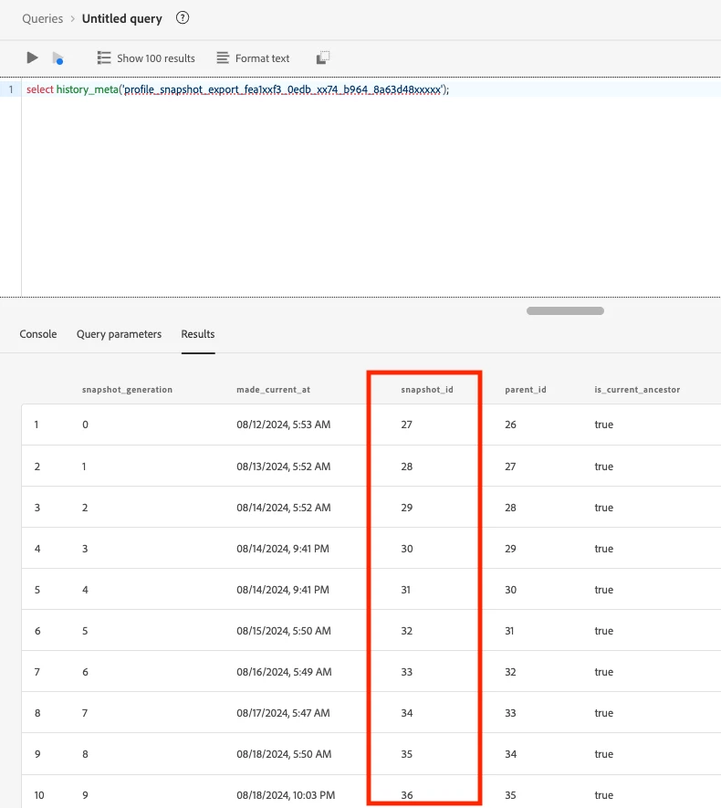 Now say you'd also like to understand if the segment membership was different with the previous daily segmentation, there is a way to query previous versions of the snapshot, each one corresponding to a specific date. Note we usually keep from 7 to 10 days in our logs.