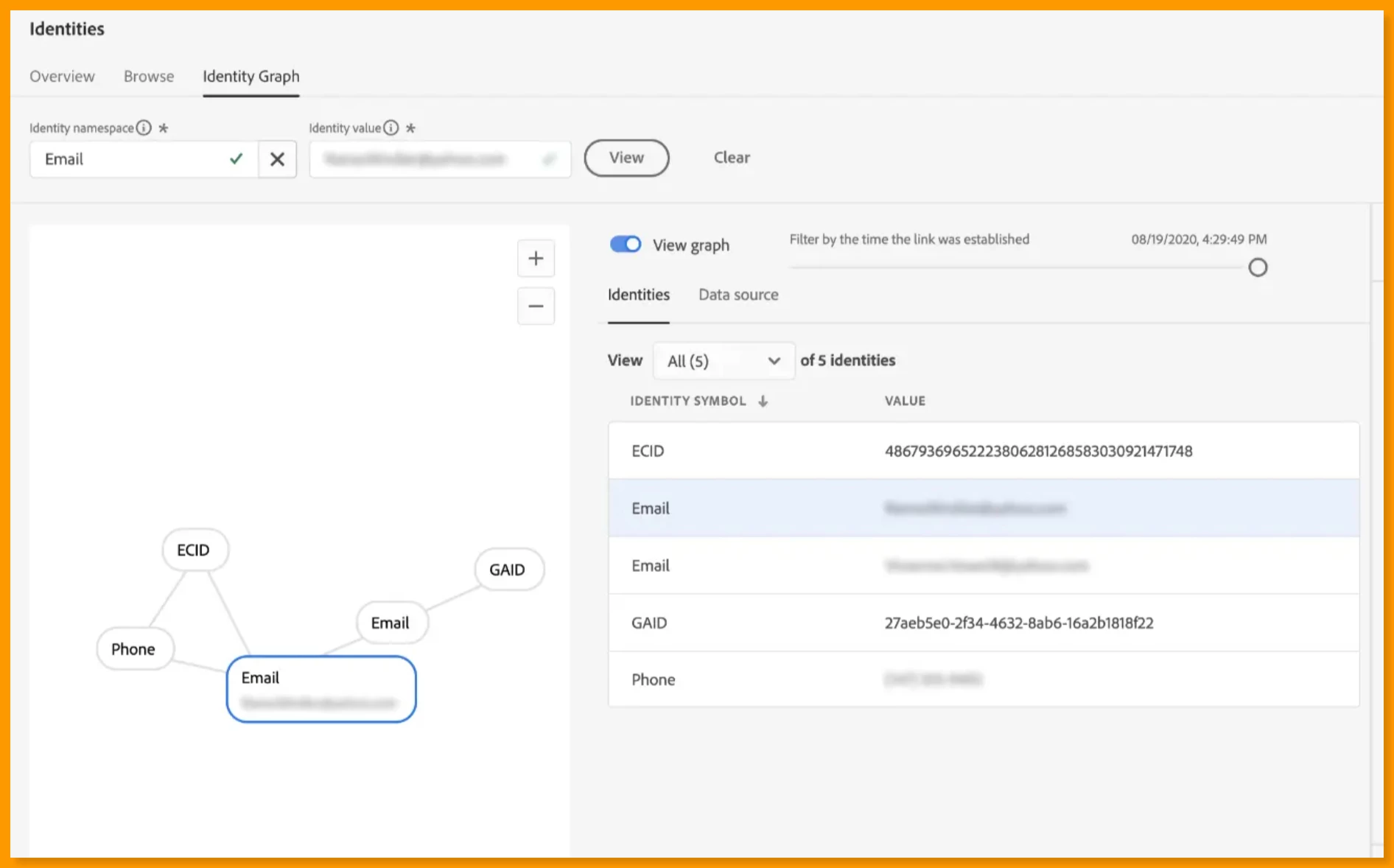 A customer's relationships across various identities are mapped out in an identity graph, which gives you a visual depiction of how they engage with your business through various channels. AEP identification Service manages and updates all customer identification graphs collectively and in almost real-time in response to consumer action.