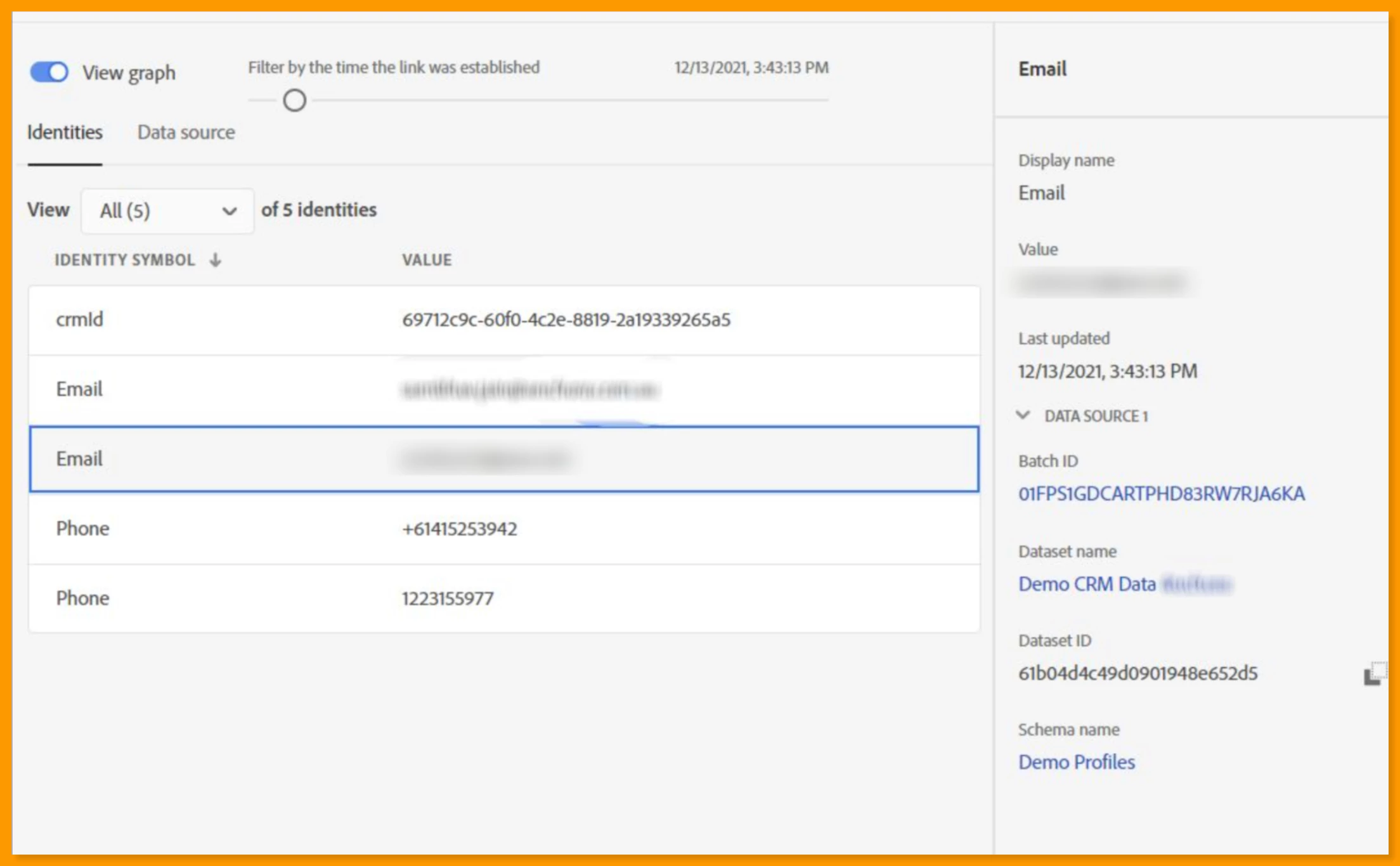 Identity graph viewer will help a user comprehend clearly what customer identities are combined and how they are combined in the Platform user interface. You can drag and interact with various areas of the graph in the viewer to analyze intricate identification links, debug more effectively, and get greater transparency over the use of information.