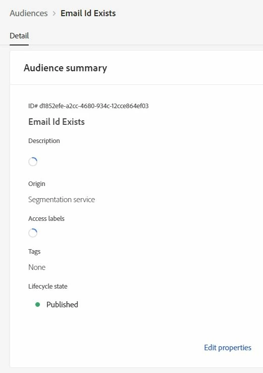 Let’s start with creating an audience in AEP. I am going to use a very simple audience definition checking for whether a profile has an email attached.