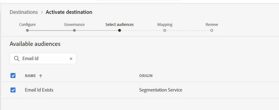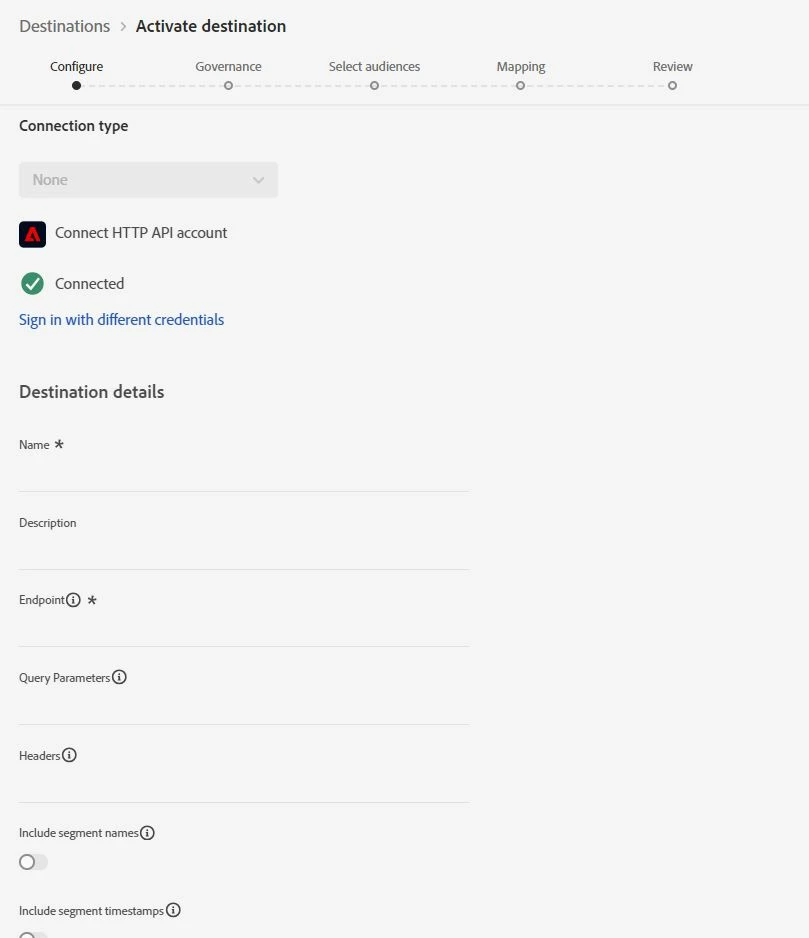 Once we have the endpoint ready and the AEP audience has started populating, i.e, it has been evaluated, we then map it to a Streaming HTTP API destination like below.