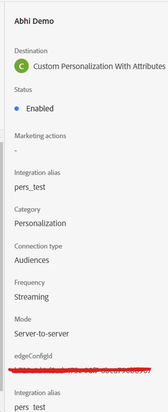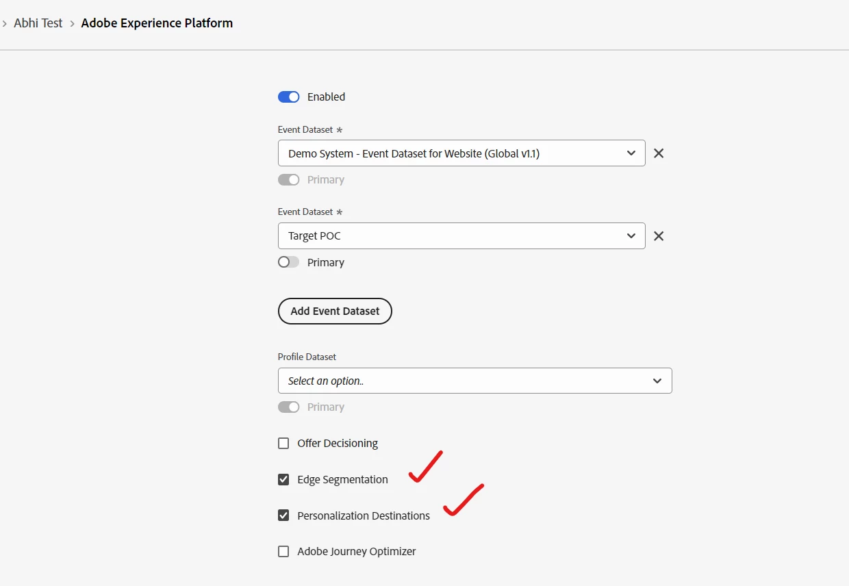 1. This destination makes use of web SDK and mobile SDK. In this particular blog scenario, you need to have Web SDK setup on your website for it to work. You also need to have the checkbox for edge segmentation and personalization destinations ticked in your datastream as shown below.