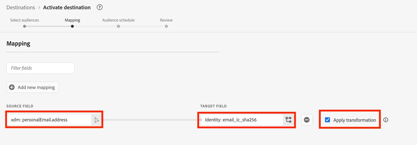 - Once in the mapping stage of activating the audience, add new mappings by selecting specific email attributes that you need in the source and target fields. Next, check “Apply Transformation” option Activate the audience.