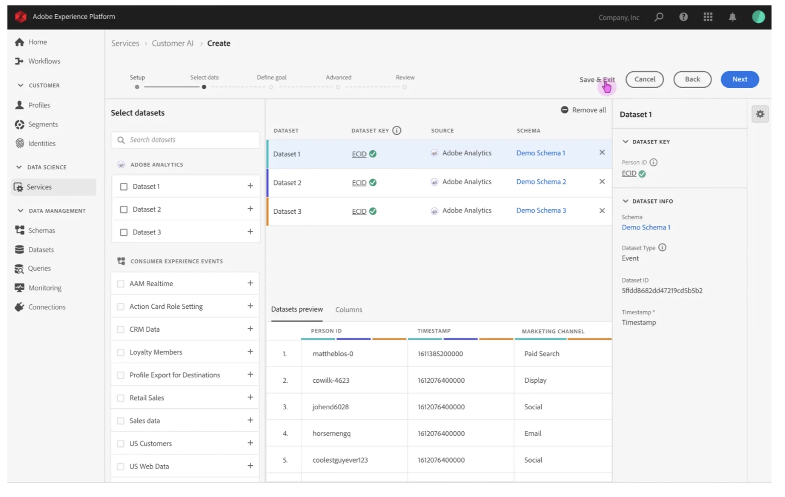 The above picture shows how you can select the relevant experience event datasets as inputs.
