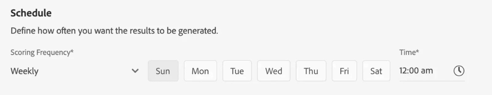 Scoring Schedule affects how current the insights are. Frequent scoring (e.g., weekly) provides up-to-date predictions, allowing marketers to adjust campaigns promptly and ensure they’re targeting the right audience as customer behavior evolves.