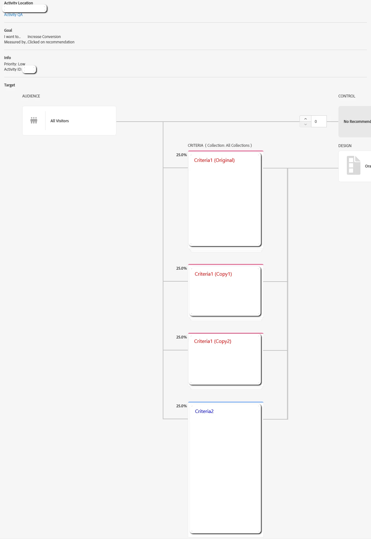 Problem: When creating a Recommendation activity if we use multiple criteria the distribution between them is always equally split. This is a good starting point however does not offer sufficient flexibility. It is currently impossible to re-allocate the distribution to 75% Criteria 1 and 25% Criteria 2 out of the box. However a known trick to help users get closer to their ideal distribution is to create multiple copies of the criteria for which we need more distribution into so that it ends up working out to what we need. See screen-shot below.