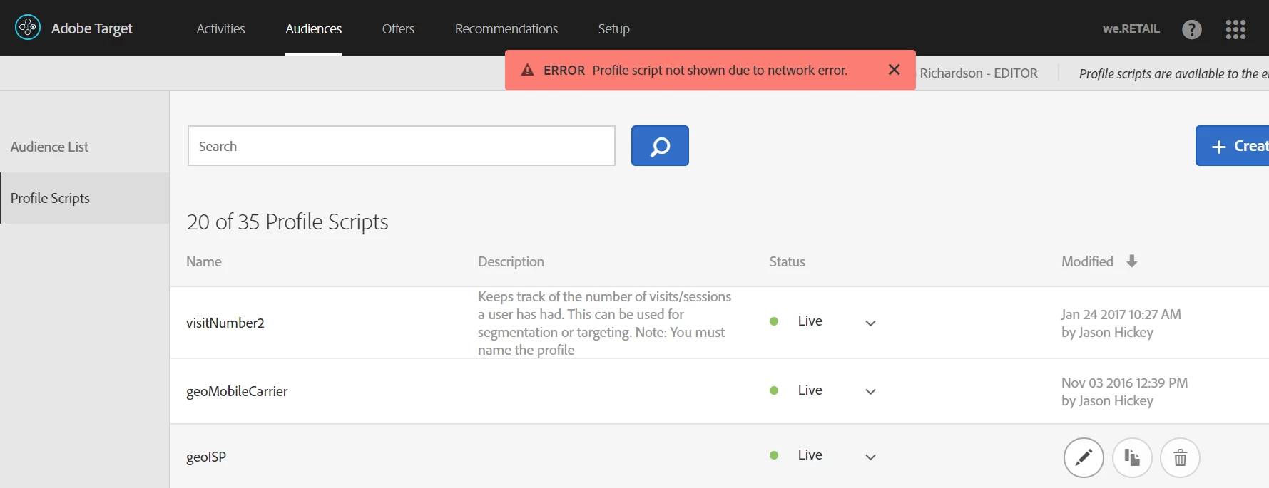 Profile scripts are found in the Target UI here: top nav: Audiences > left nav: Profile Scripts