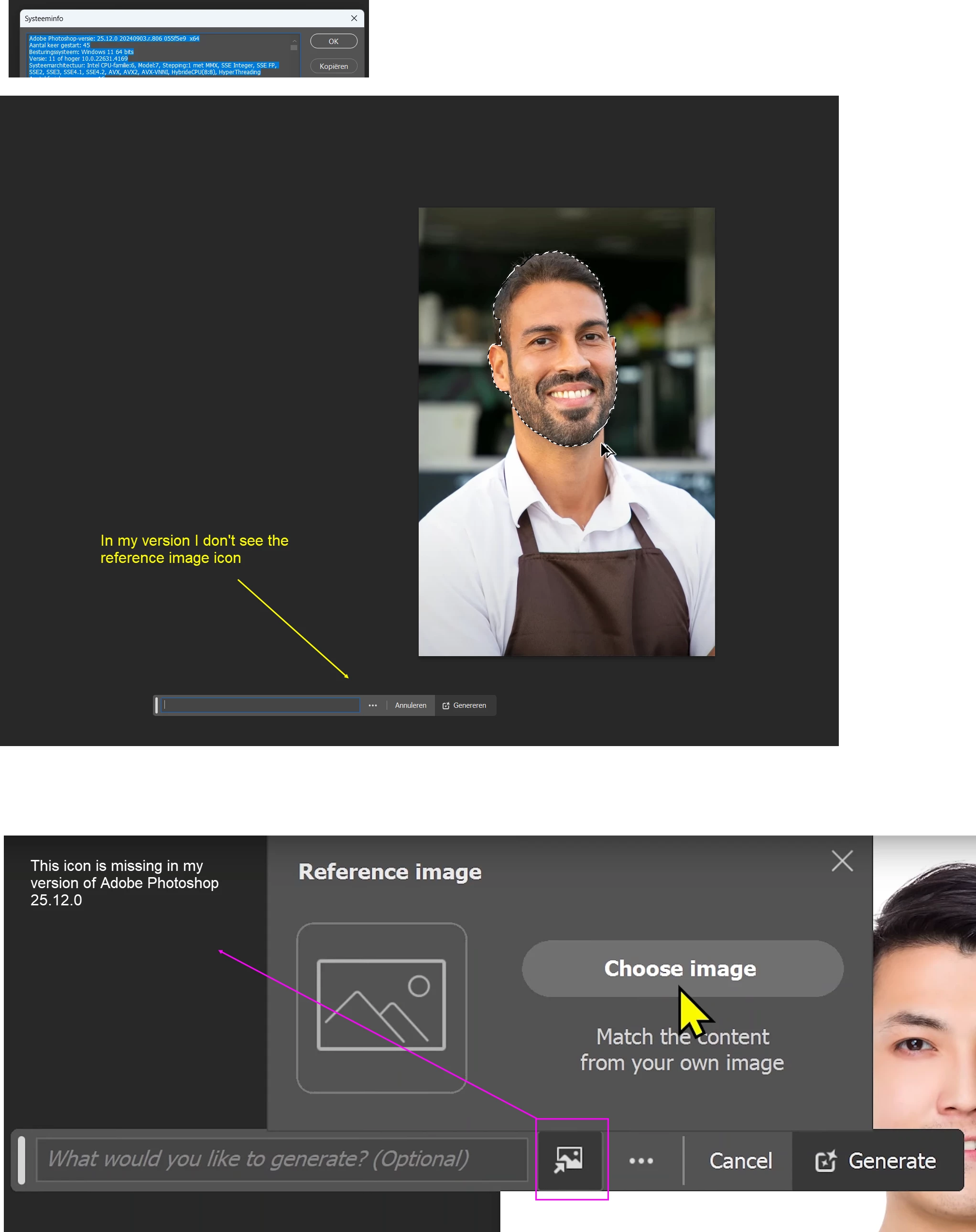 I installed the latest version (version 25.12.0) of Adobe Photoshop on my computer, but I can't see the Reference Image icon near the generative fill field. This prevents me from using the function. Any advice would be greatly appreciated.