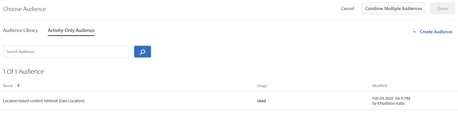 Current interface only facilitates with a flow of actions where user might have to delete this audience from ‘Activity-Only Audience’ list and then will have to recreate it under ‘Audience Library’. Apparently, this would not be effortless if you are setting up a composite audience. An instance where user might have faced recreation of their Test Audience based on Geo-locations with 40+ values.