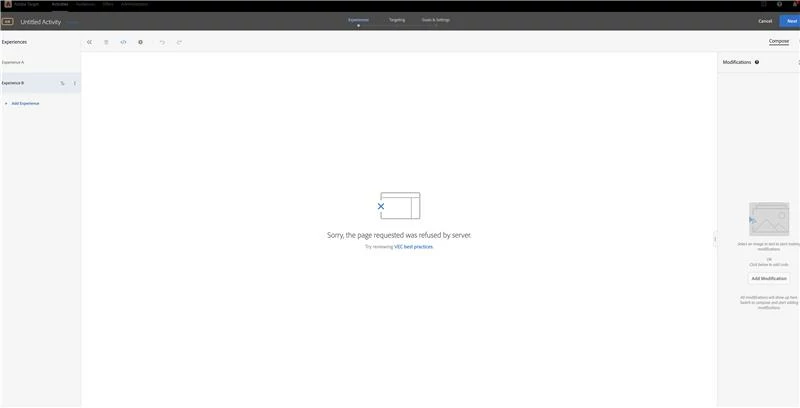 I am getting errors while creating activities in Adobe Target. Error is "Sorry the page requested was refused by server". I tried with all browsers but still had the same issue. I checked with cookie issue with browser but no issue with it.