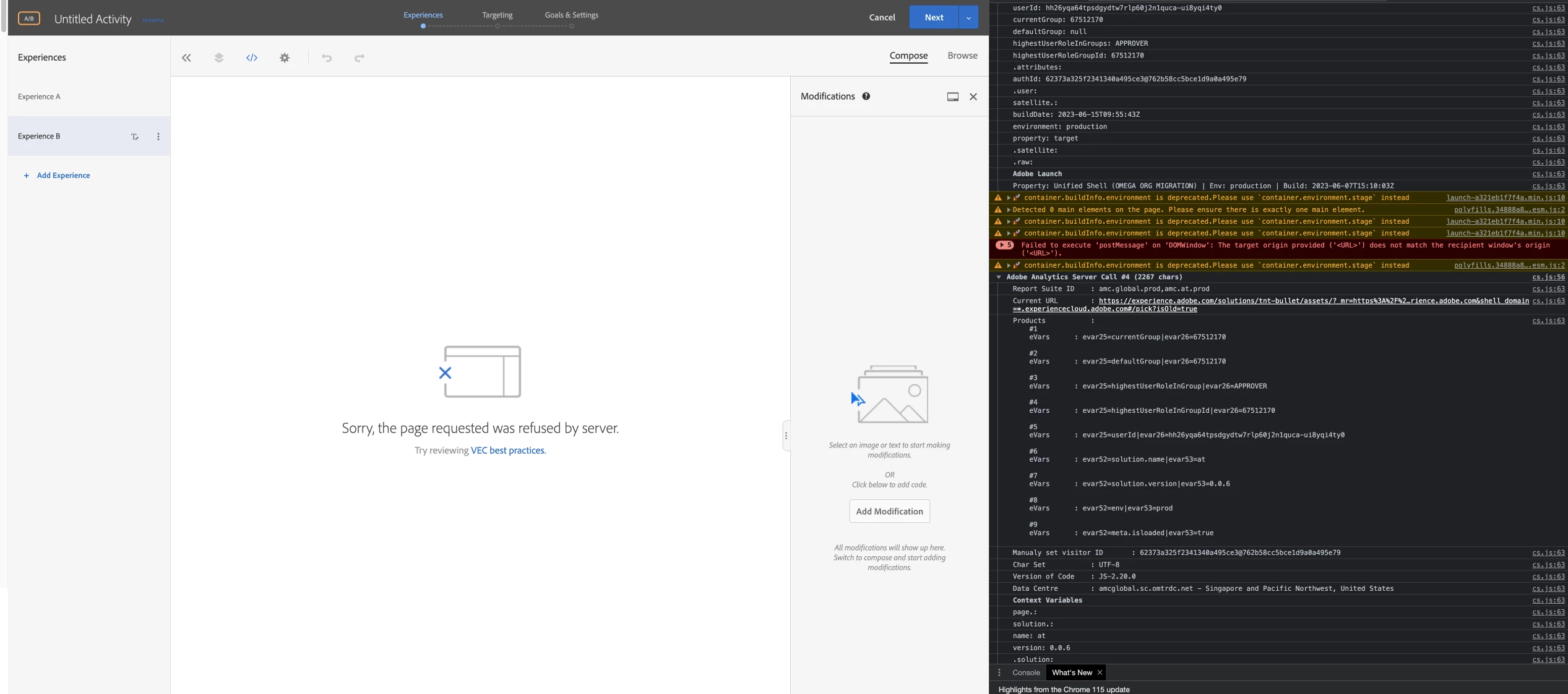 Adobe target Error in VEC- Sorry the page requested was refused by server