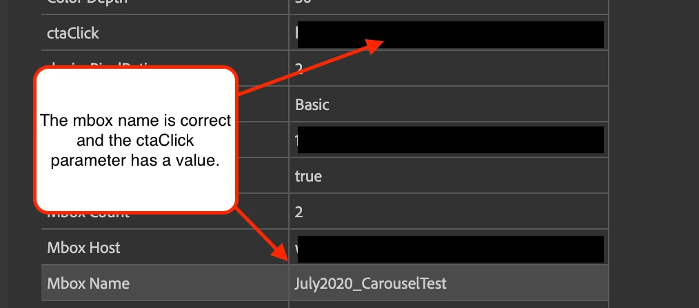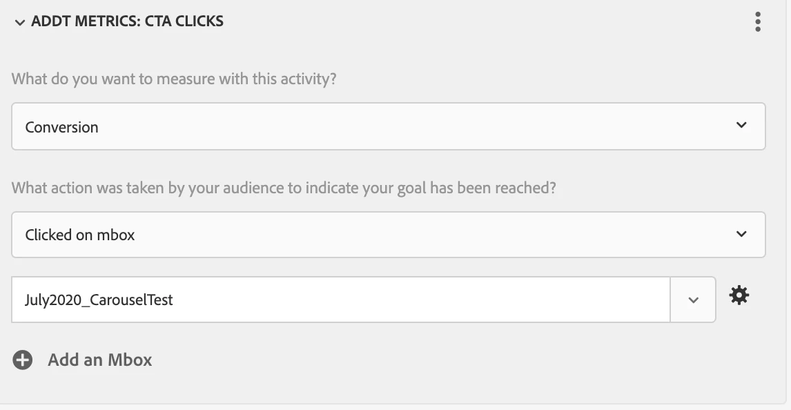 In my Target activity, I've created a a conversion metric targeting the mbox mentioned above. I have a refining audience requiring a value be present in the ctaClick parameter. See below for screenshots detailing this.