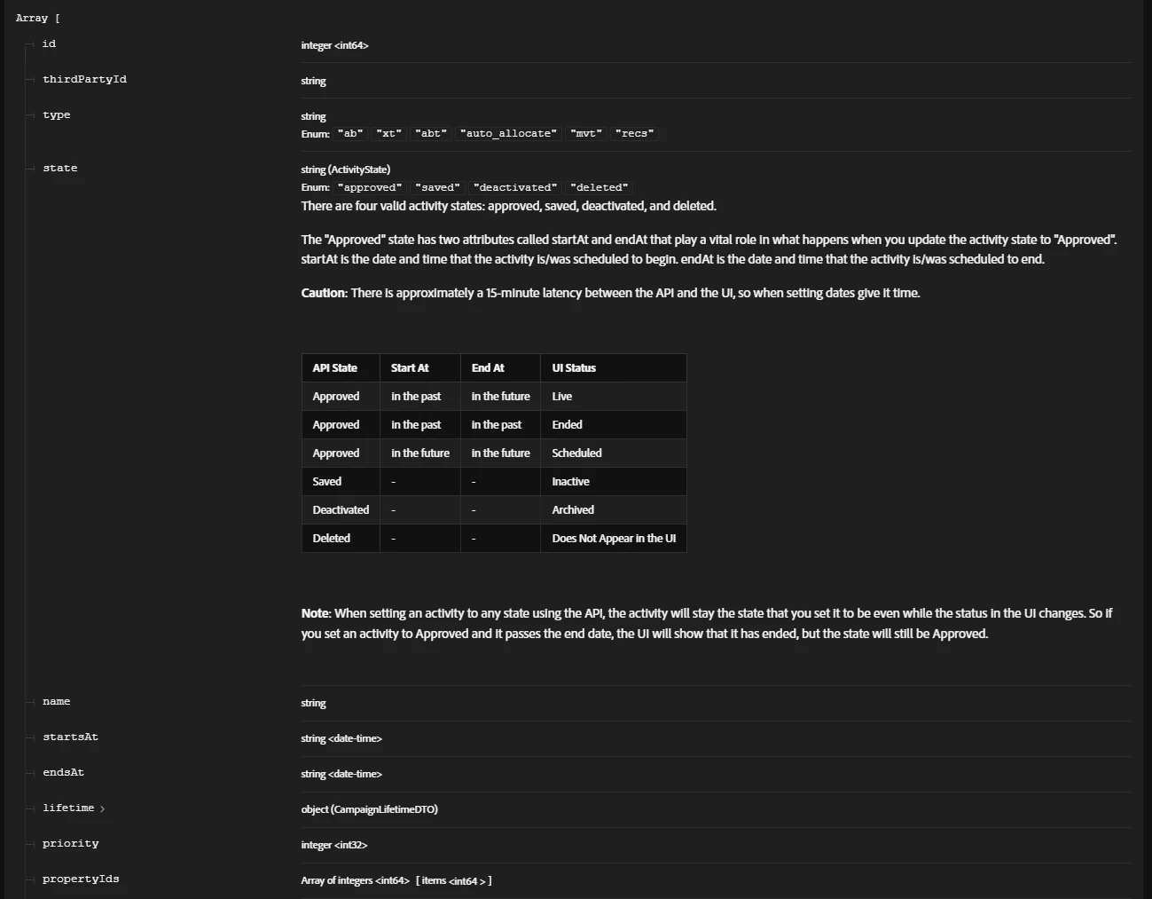 The documentation says you have to pass state=approved, but also says you have to pass startAt and endAt, which is not clear. I want to list all the campaigns which are live now and end in the future. I want to replicate the same filter which is available from target UI.