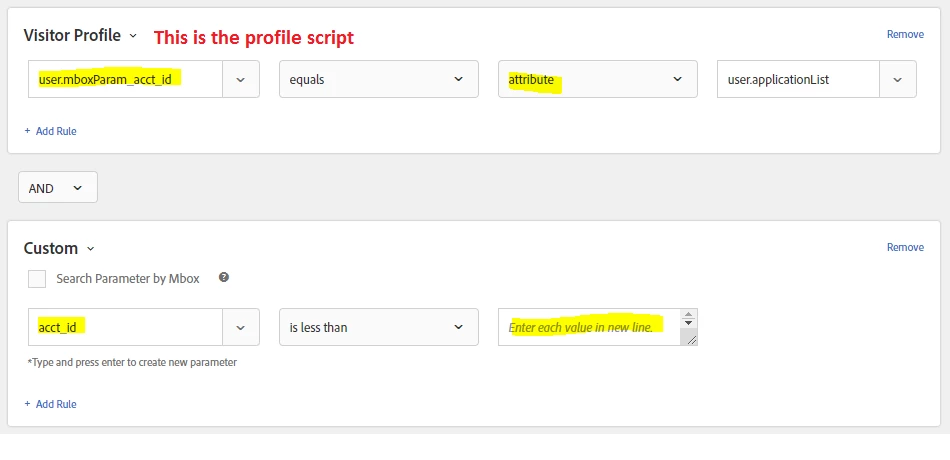 It is only possible to directly compare an mbox parameter with a static value, which limits the ability to easily do personalisation on a segment-of-one basis. Meanwhile, it is possible to compare profile scripts and other attributes directly to attributes. See the below screenshot as an illustration of the two differences.