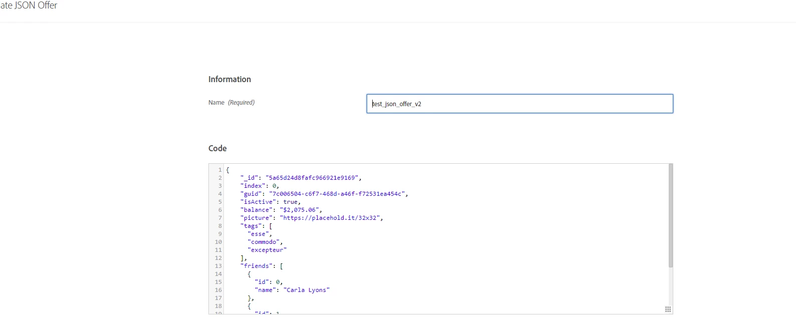 2. I want the headline, subtitle and text body content in a JSON Offer