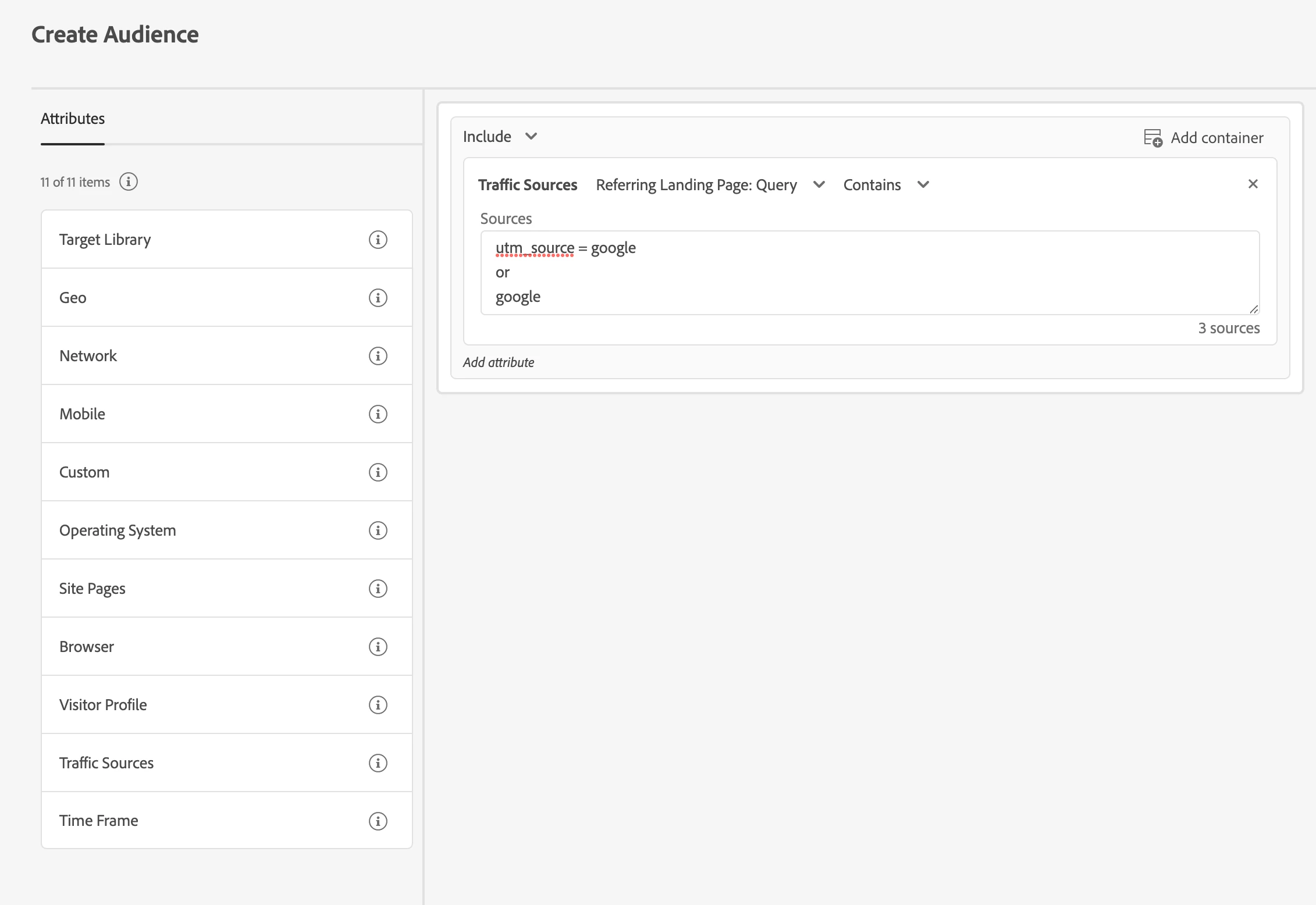 When specifying a traffic source based on referring LP Query, syntax wise how do I input the source? I.e. tracking affiliate traffic via utm_source contains affiliate | tracking paid traffic from google (not organic) utm_source contains google.
