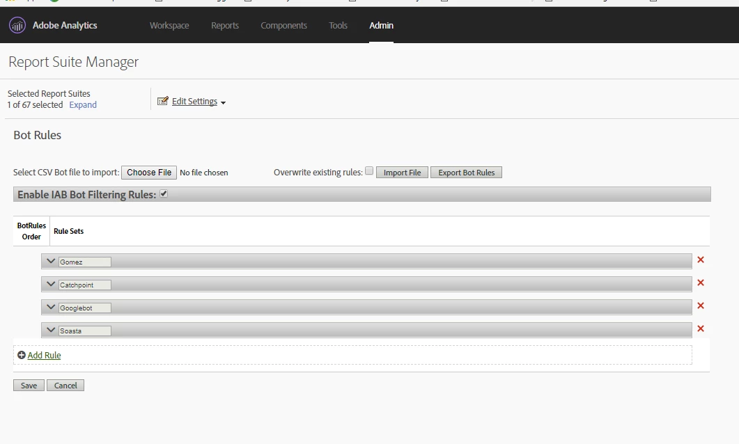 Similar functionality can be found within Adobe Analytics (see screen shot below). The IAB Bot Filtering can be checked to filter out known bots, and then the ability to add specific user-agents as well is provided.