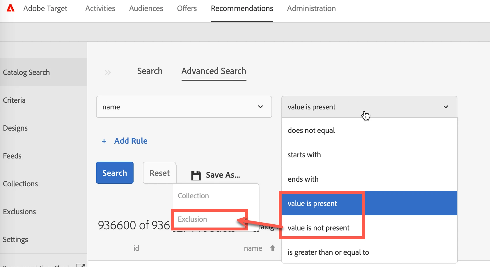 Catalog Search - it can't save as "Collection" or "Exclusion" in Advanced Search interface.