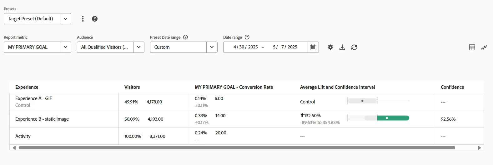 I have been running a test for just over a week, tracking a GIF vs static image. For reporting, we wanted to see how many people clicked the CTA on each version of the page.