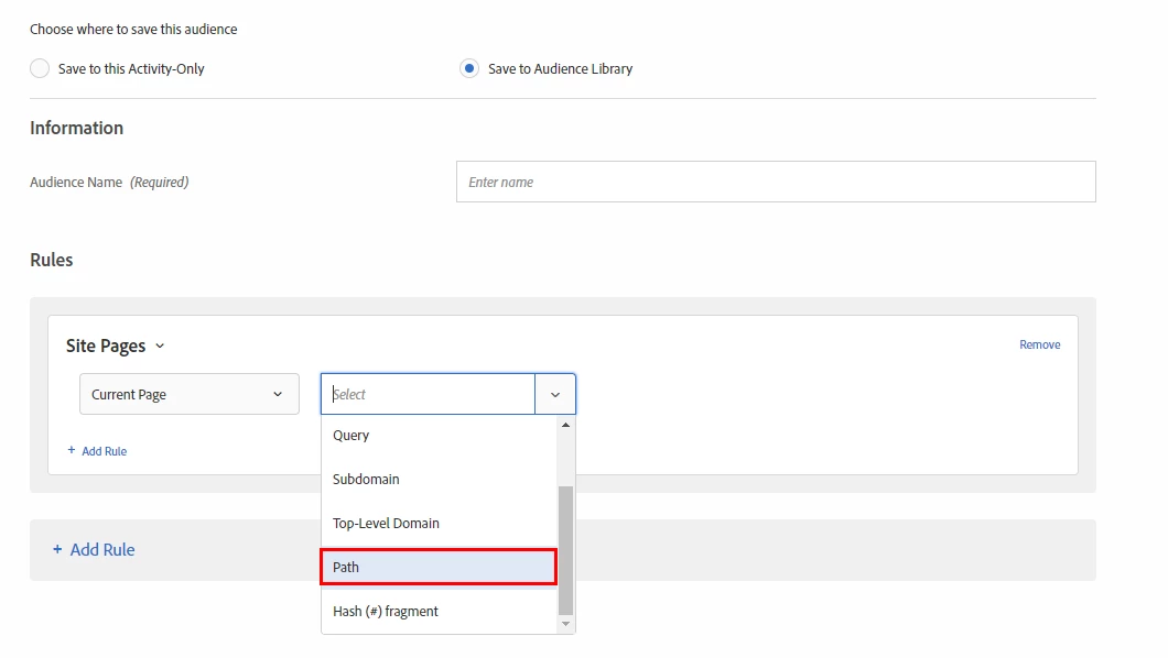 I'm trying to create an audience using Site pages rule. I have put "current Pages" and then need to set the page range by selecting one of the options underneath.