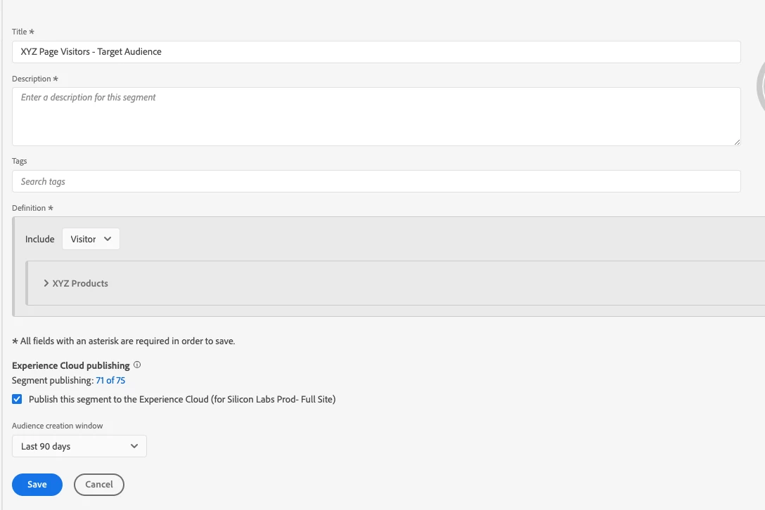 2) I have one Adobe Analytics segment that I have published with a look-up window of 90 days. This segment is coming up in my Target Audience Library already. Here is the AA segment that I want to use: