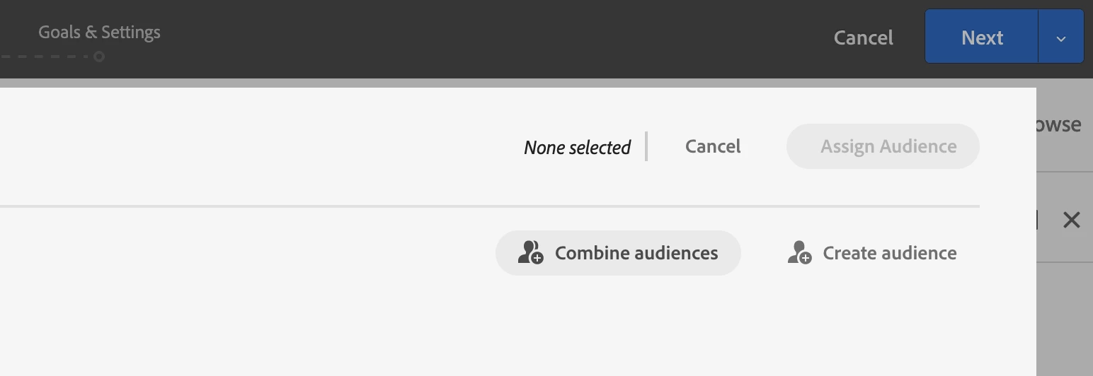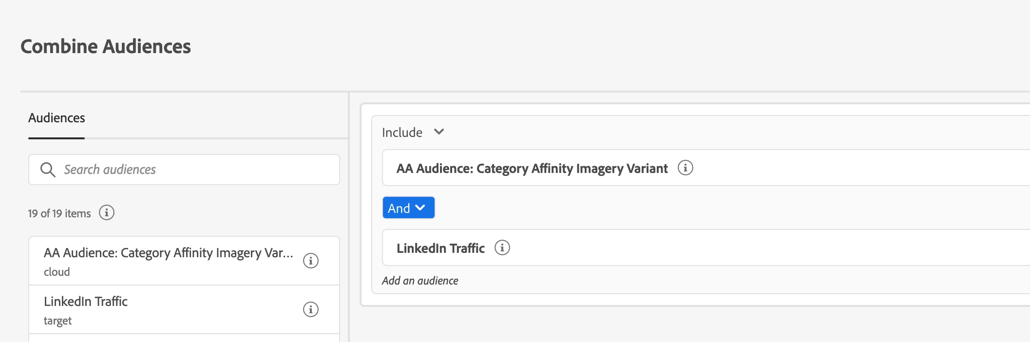 My question is how to combine these above two? I don't see any option to pull the Analytics segments from the library while creating an audience below:
