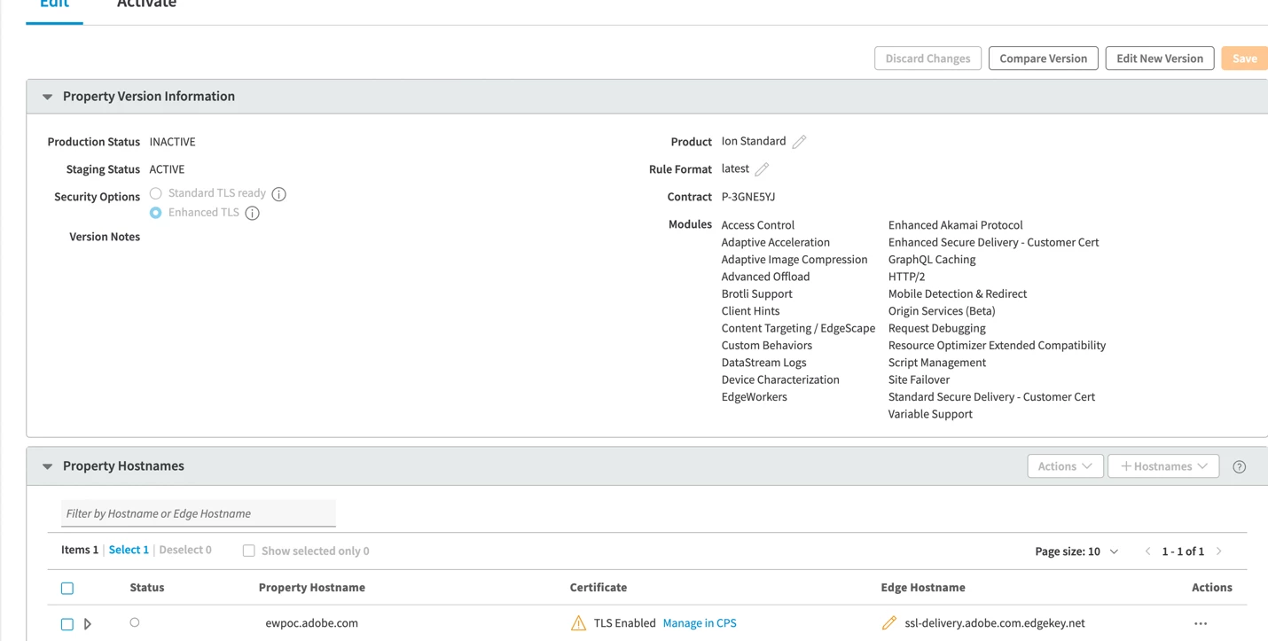 1. Find your edge hostname - Locate the Akamai-generated hostname (e.g., ssl-delivery.adobe.com.edgekey-staging.net) that serves your content