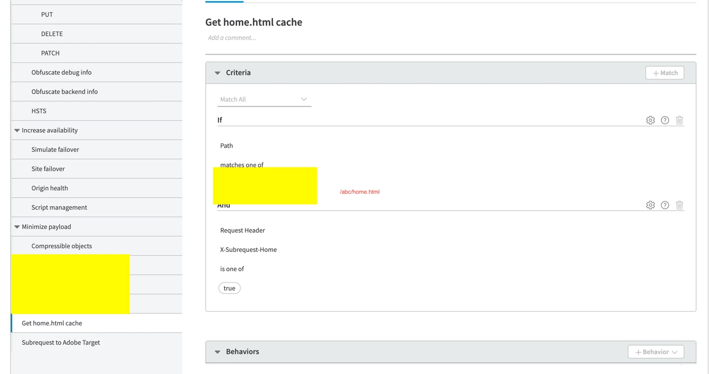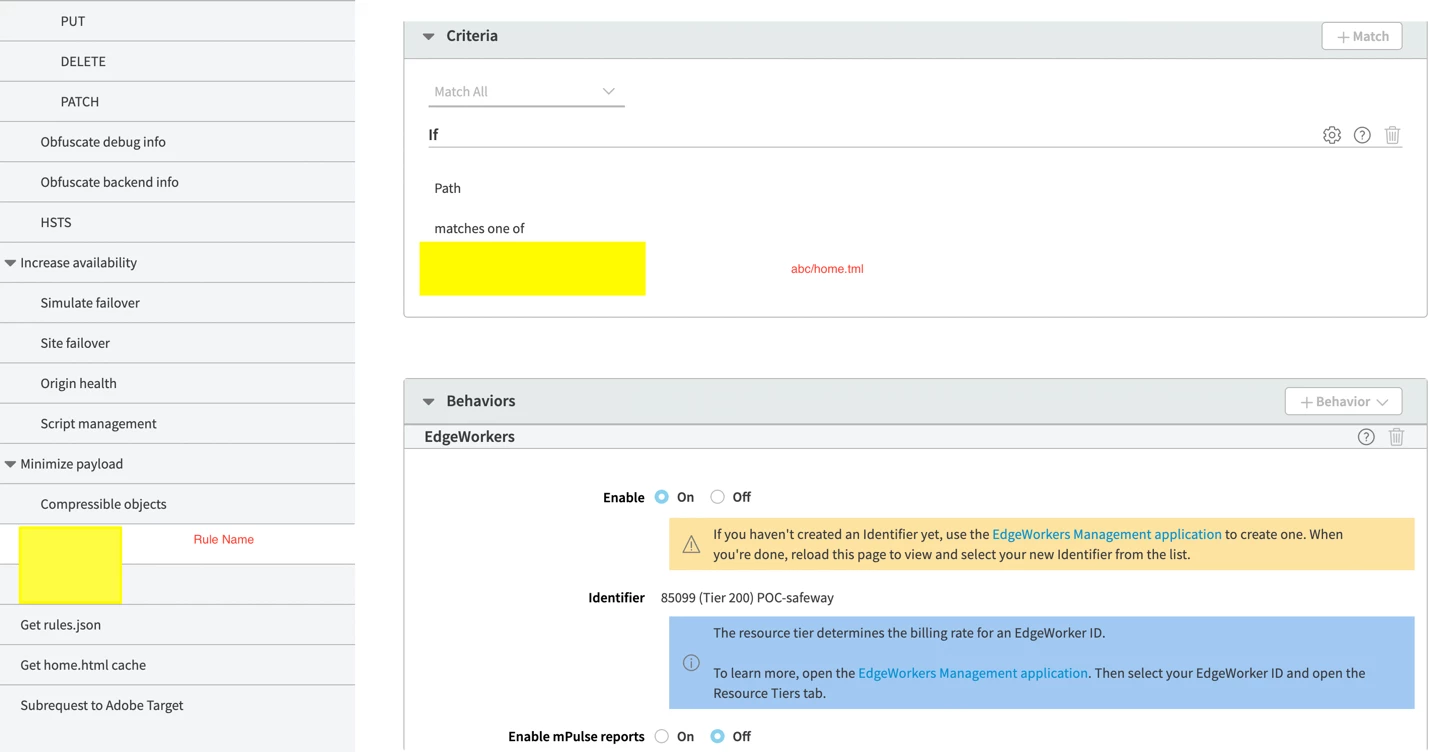 - Executes EdgeWorker code when URL matches /abc/home.html - Triggers your personalization logic for specific page requests, ensuring targeted application of A/B testing