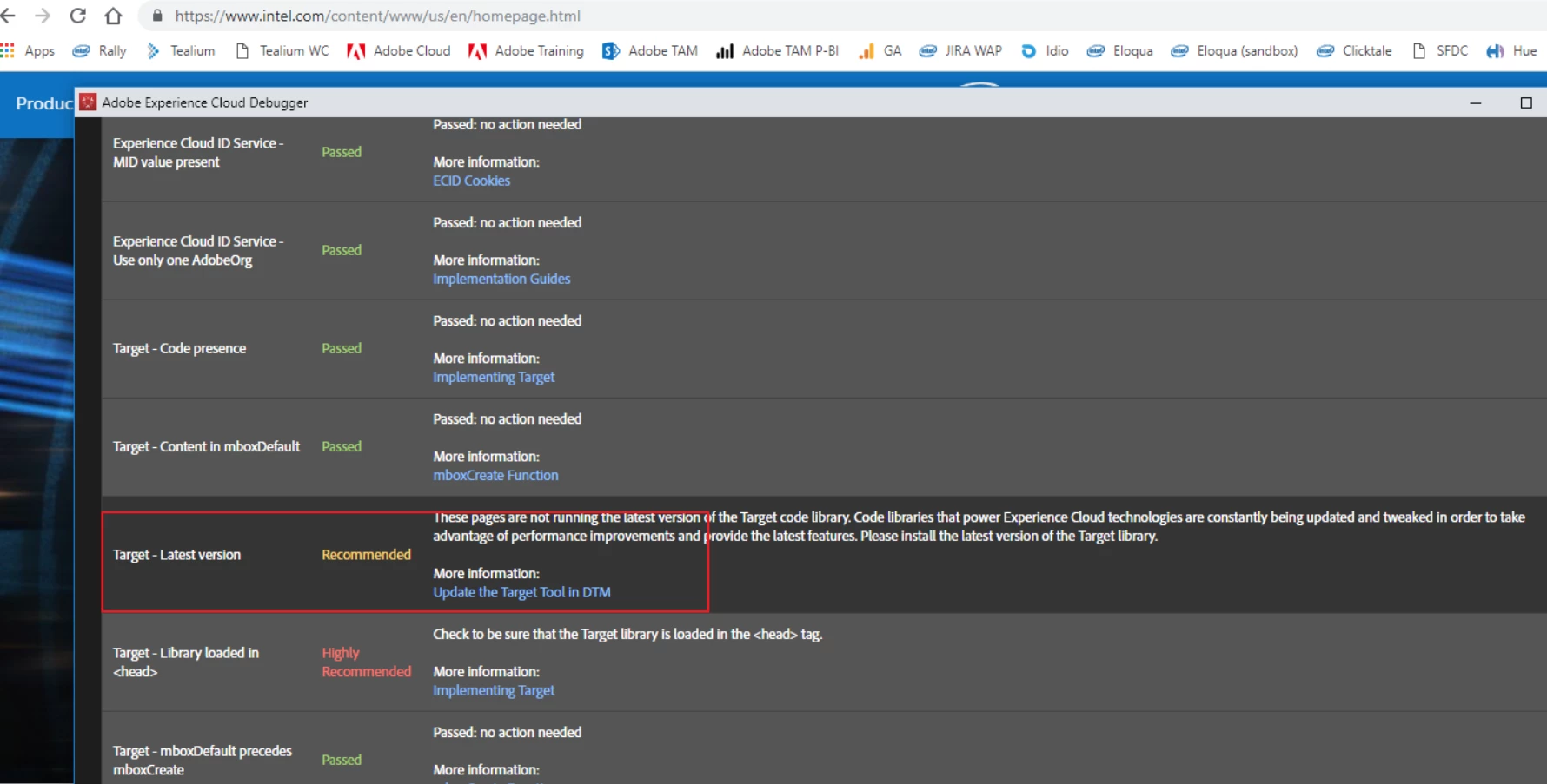 We used the Experience Cloud Debugger to asses the status of our implementation. Per this KB: https://www.intel.com/content/www/us/en/homepage.html the last two versions of at.js are officially supported. Additionally we have made a business decision to stay on v1.7.1 as v2.0 is still overcoming growing pains. We don't like the fact that the audit shows that we aren't on the latest code version. Technically we are on the latest code version we just don't want to be on the bleeding edge of SPA with at.js v2.0 can the Experience Cloud Debugger be improved so that latest version of both the SPA and non SPA version of at.js come up as "Passed"