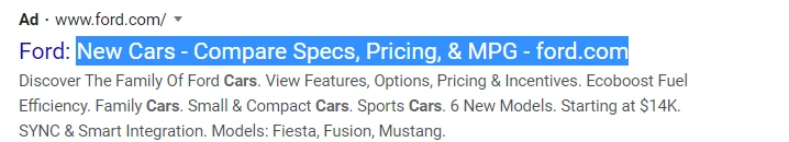 For example, suppose my paid ad contains :"New Cars - Compare Specs, Pricing & MPG", similar to this paid advertisement by ford.