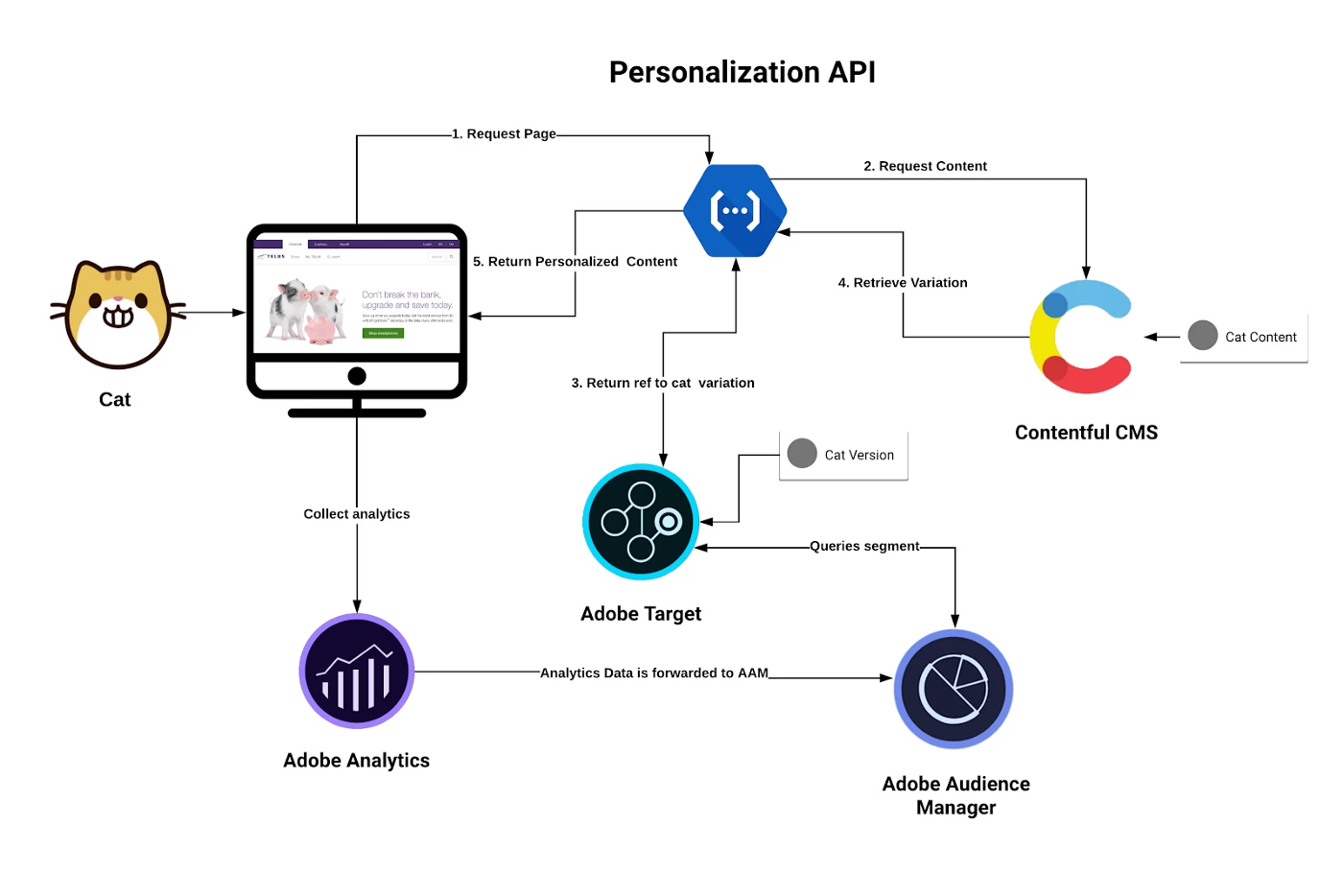 The Personalization API is middleware, and also acts as an aggregator between systems. The sequence of events is as follows: