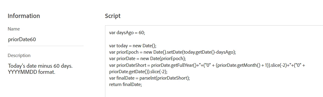 I'm working to exclude outdated articles for a recommendation activity but I'm having some trouble with the profile script that is supposed to return the current date minus 60 days, in order to create a 'greater than or equal to' audience to exclude old articles. Here is the script I'm using, seems to be something wrong with the syntax because Target wont let me activate it. Any advise? Is there an easier way perhaps?