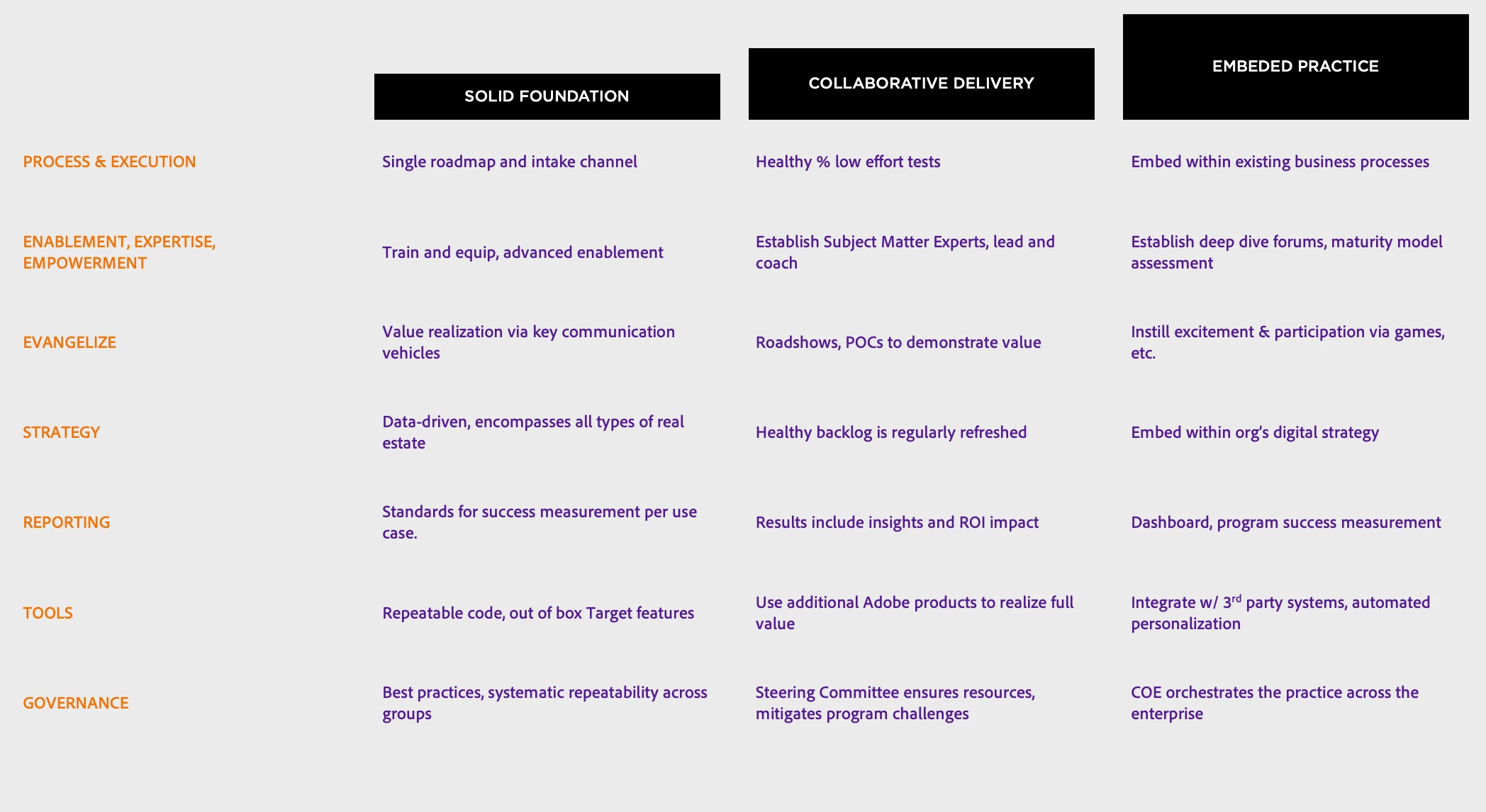 - Does your team understand Adobe Target’s capabilities (e.g., A/B, XT, Auto-Target, Recommendations)?