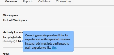 I understand that Target have provided an "Activity QA" URL which appends parameters to the site, however depending on how the Target's activity / experiment is setup, the "Activity QA" URL might not be available. For instance, if the activity is set to have one initial audience, but each location is filtered down again based on difference audience criteria, with this config we're unable to get the QA URL parameters. Most of the published/activated experiments are already configured in a way where the "Activity QA" URLs cannot be used. Screenshot attached below of what it currently shows for me.