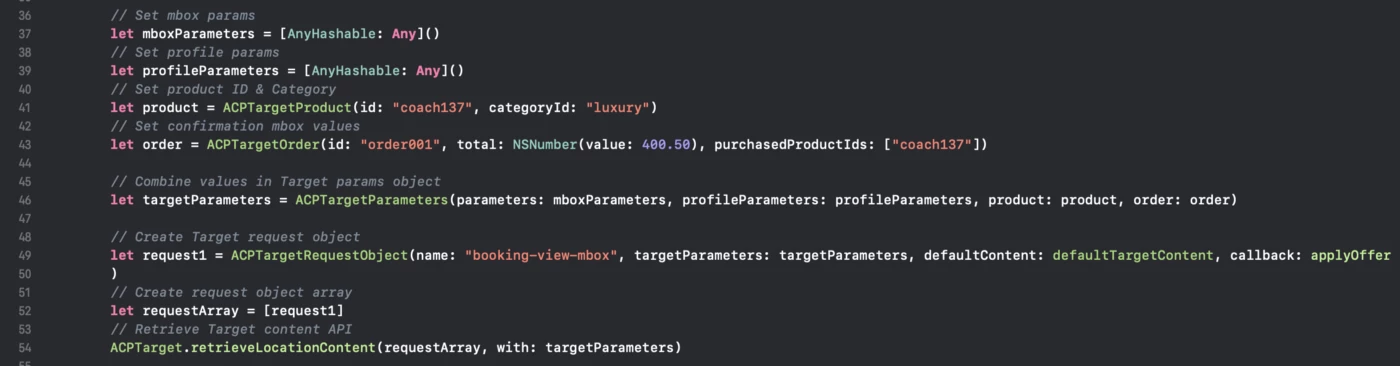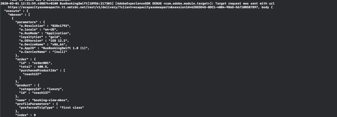 Again, it’s worth building your app at this point to make sure that the additional parameters are being included in the request that’s being sent. In the screenshot below you can see “loyaltytier” in the main “parameters” object, the “order” and “product” objects, as well as my “preferredTripType” property in the “profileParameters” object.