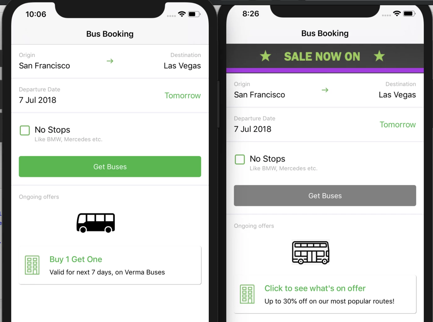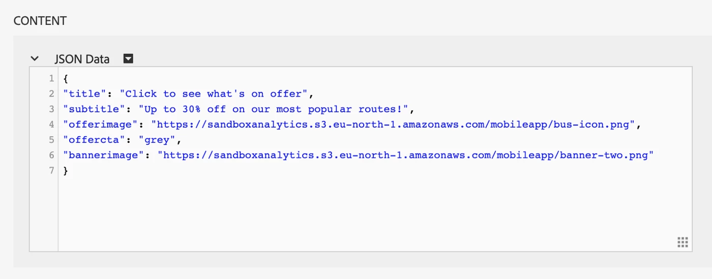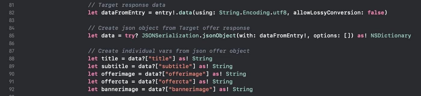 I won’t go through the detail of the function in this post because exactly how this is done will depend on how your app is built and the tests that you want to run. However, thinking back to my requirements in section 1, it should be clear that applyOffer has to be able to handle: a sale banner image, a CTA colour, a bus icon, headline copy and some offer text. The screenshot below shows how applyOffer starts off by handling the response from Target, by assigning each value in my json structure to its own variable.