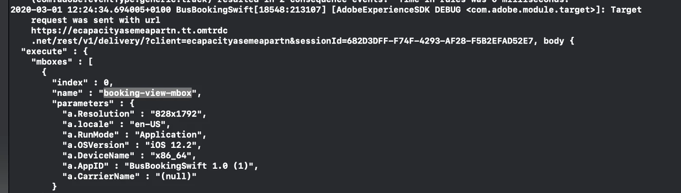 It would make sense to build your app at this point to make sure that the requests are being sent. If you check in your debug console you should see an entry that states “Target request was sent with url” with your mbox name listed against the “name” key: