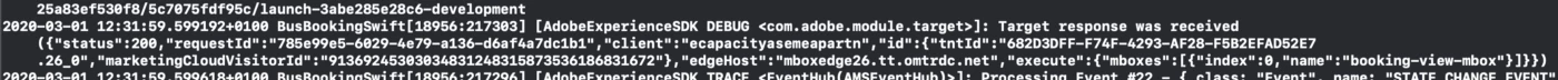 Finally, if you continue to scroll further down the debug statements then you should eventually see an entry confirming “Target response was received”. At this point, with no activity or offer content set up in Target, there’s not too much to see, so the main thing to check is that you have a response status of 200: