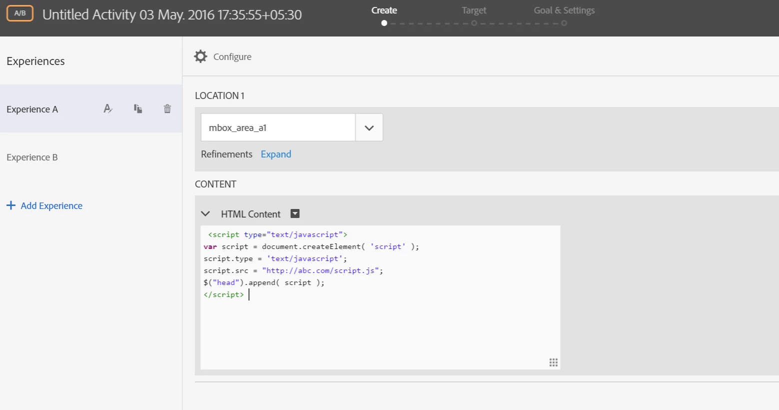 I'm trying to set up a new Experience in Target Premium that uses an HTML offer.