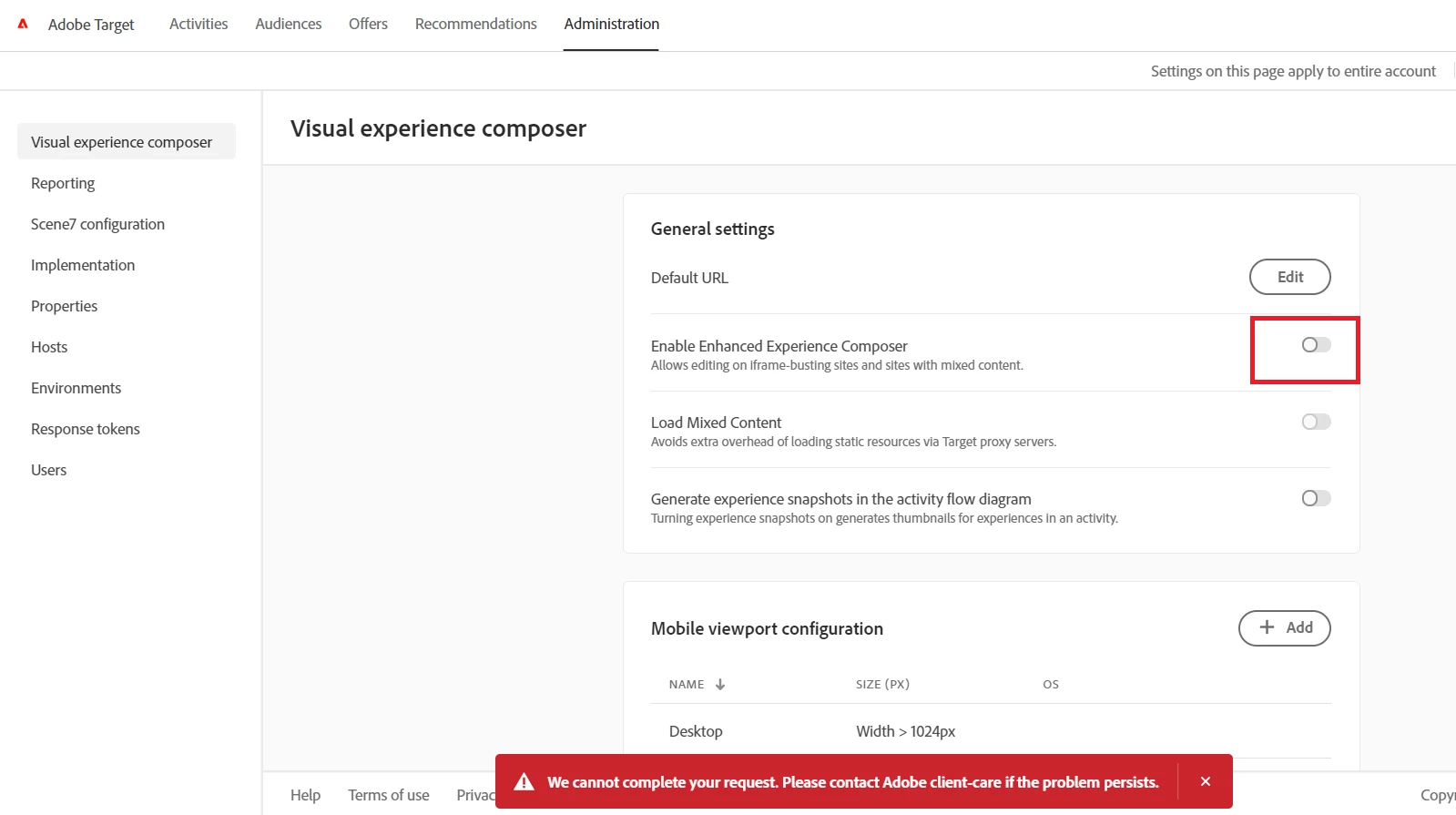 When I try to enable the EEC in the Target, I receive this message: "We cannot complete your request. Please contact Adobe client-care if the problem persists."