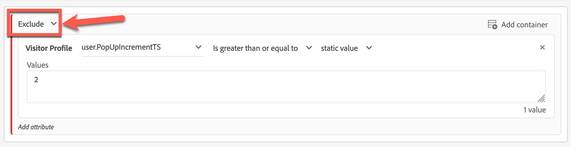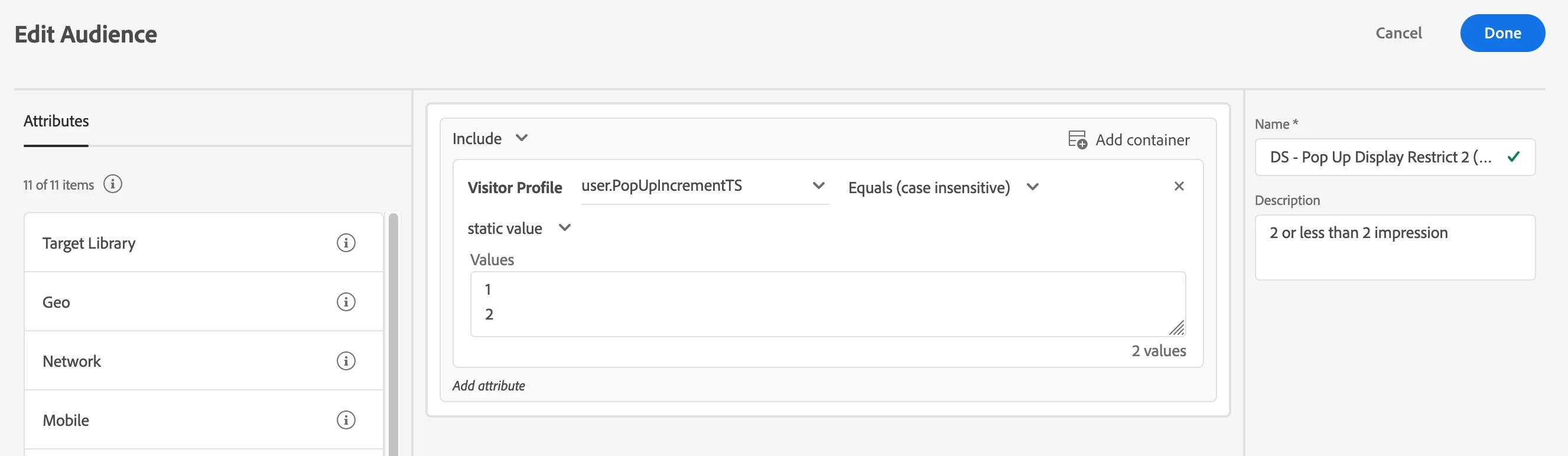 I have applied impression capping to the POP UP display by restricting it to 2 times display as below: