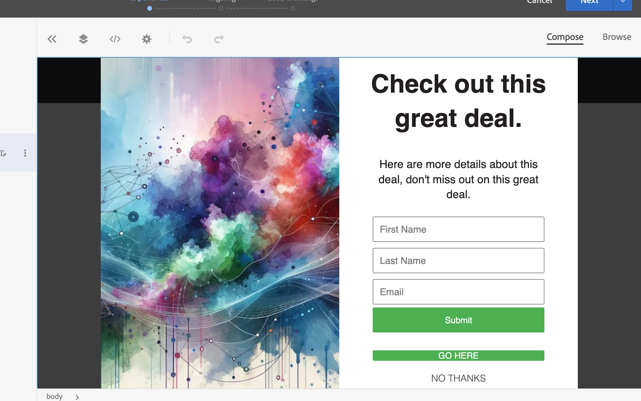 I am wondering how I can incorporate a form via Adobe Target to capture user data like first name, last name, email address, etc. within the Lightbox pop-up templates.