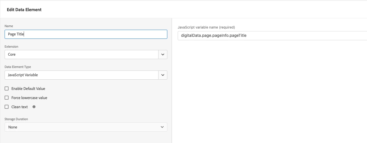 Creating a data element using a javascript variable didn't work for me so I tried changing it to below & it some how worked for me. Rest stays the same. I just mapped my page variable to this data element it gets attached in target calls