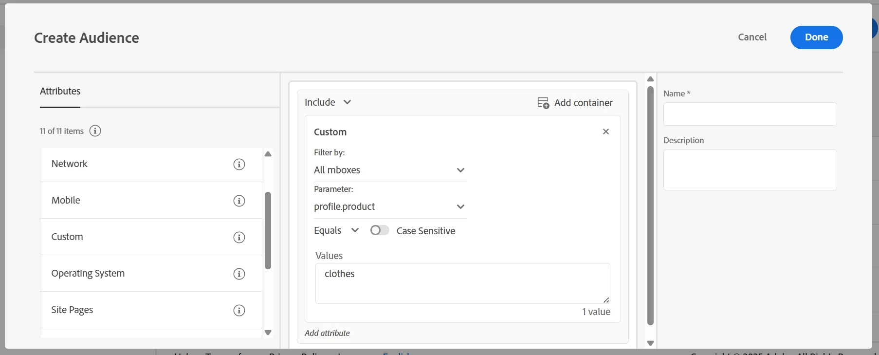 Note- the profile parameter name will not be availabe initially, fire the mbox for few times and in sometime Adobe Target will recognize it. Also, you can change mbox name from All mboxes to the name of mbox you are using.