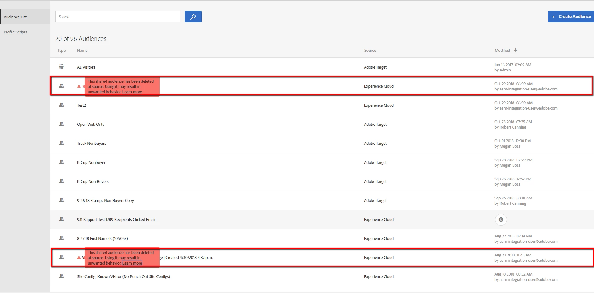 Description: Audiences that are created in Audience Library show up in Target. This is really nice until you delete the audience from Audience Library after which point it will be gone from Audience Library but still show up in Target UI in the Audience list.
