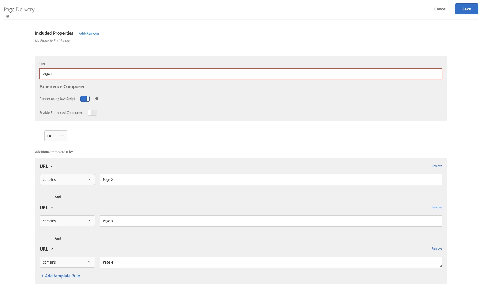 I'm trying to deliver a test on 4 different pages. For instance, four different product pages. My first thought was to go into the page delivery and add a template rule "Or" to do a "URL Contains" for each page. What I've found is that you can only do one "Or" in template rules, and the rest must be "Ands". Therefore, I can only extend an activity to two pages using Page Delivery.