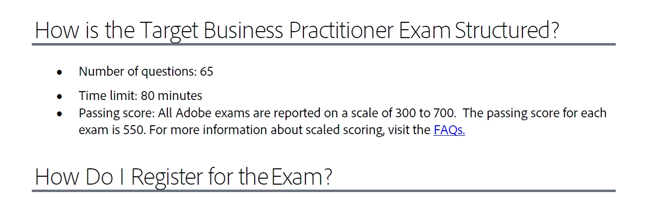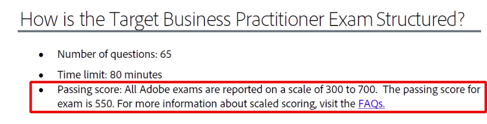 I used to take Adobe Analytics Developer and Adobe Target Analyst certifications before, and both of them point out the exactly passing score like 69%, 80%.