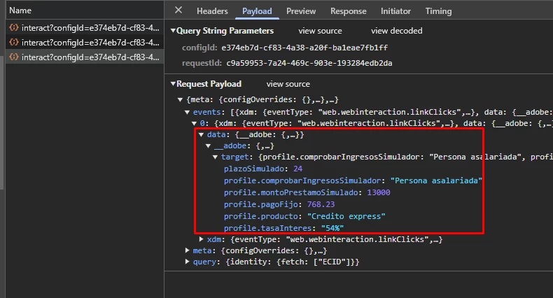 To verify that the data is being sent to Target, I checked the request payload and confirmed that the object with the necessary data is included, as shown in the attached image.