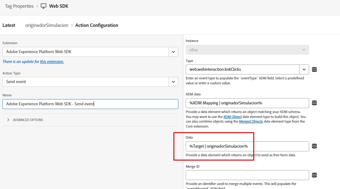 In Target, I created a profile script (named originadorSimulacion_producto) that uses one of these fields: