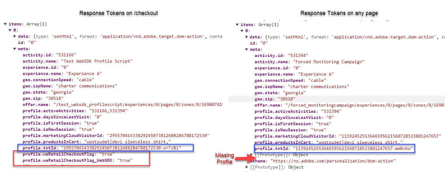 If the tntId isn't persisting then it's certainly a broader implementation issue, not an issue with profile scripts per se. I can also see that the marketingCloudVisitorId is different in the screenshot. Is the checkout page on a different sub-domain/domain vs the other pages?
